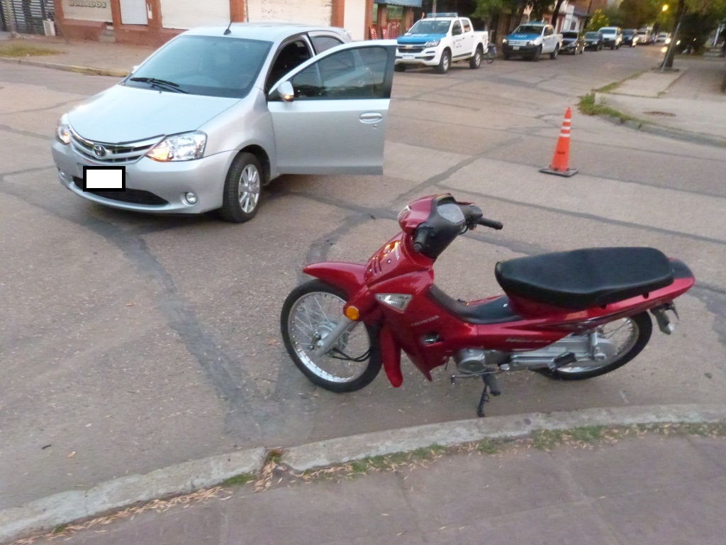 Un siniestro vial se registro en la tarde de este pasado sábado 06 de Abril en calles Frías y Brown,  y tuvo como protagonista un  automóvil TOYOTA ETIOS conducido por una mujer de 45 años  y una MOTO HONDA WAVE conducida por un hombre de 25 años, este ultimo joven  domiciliado en  Mojones Sud 1ra y debió ser trasladado hacia el Hospital en ambulancia. Se le dio intervención al médico de policía en turno quien dictamino que presentaba lesiones de carácter leves. Se procedió a la retención de moto vehículo por haberse constatado una infracción a la Ley Nacional de Transito, dando intervención al Mecánico y fotógrafo policial en turno.-
