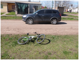 Siendo aproximadamente las 13:30 se produce un Siniestro vial de carácter grave en la intersección de calles Belgrano y Alsina que tuvo como protagonistas, una camioneta marca Chevrolet, conducida por un señor de 43 años de edad, domiciliado en el distrito Mojones Norte, y una bicicleta tipo Mountain Bike rodado 26, en la que se conducía un menor de 15 años de edad con domicilio en esta ciudad, quien fue trasladado al hospital Santa Rosa, donde es examinado por el médico policía de turno determinando lesiones de carácter Graves por fractura de pelvis y politraumatismo de cráneo. Intervino además personal del Gabinete de Criminalística para sus fines específicos.