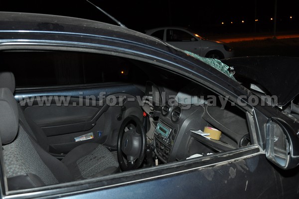 El Ford «K» que quedó destrozado, el parabrisas tiene huellas de un golpe desde el interior, mientras que el volante estába en el piso del automovil en su alocada carrera le pega a un carrito de venta de panchos que ocasionalmente se ubica en el ingreso a la calle recreativa desparramando su mercaderia.