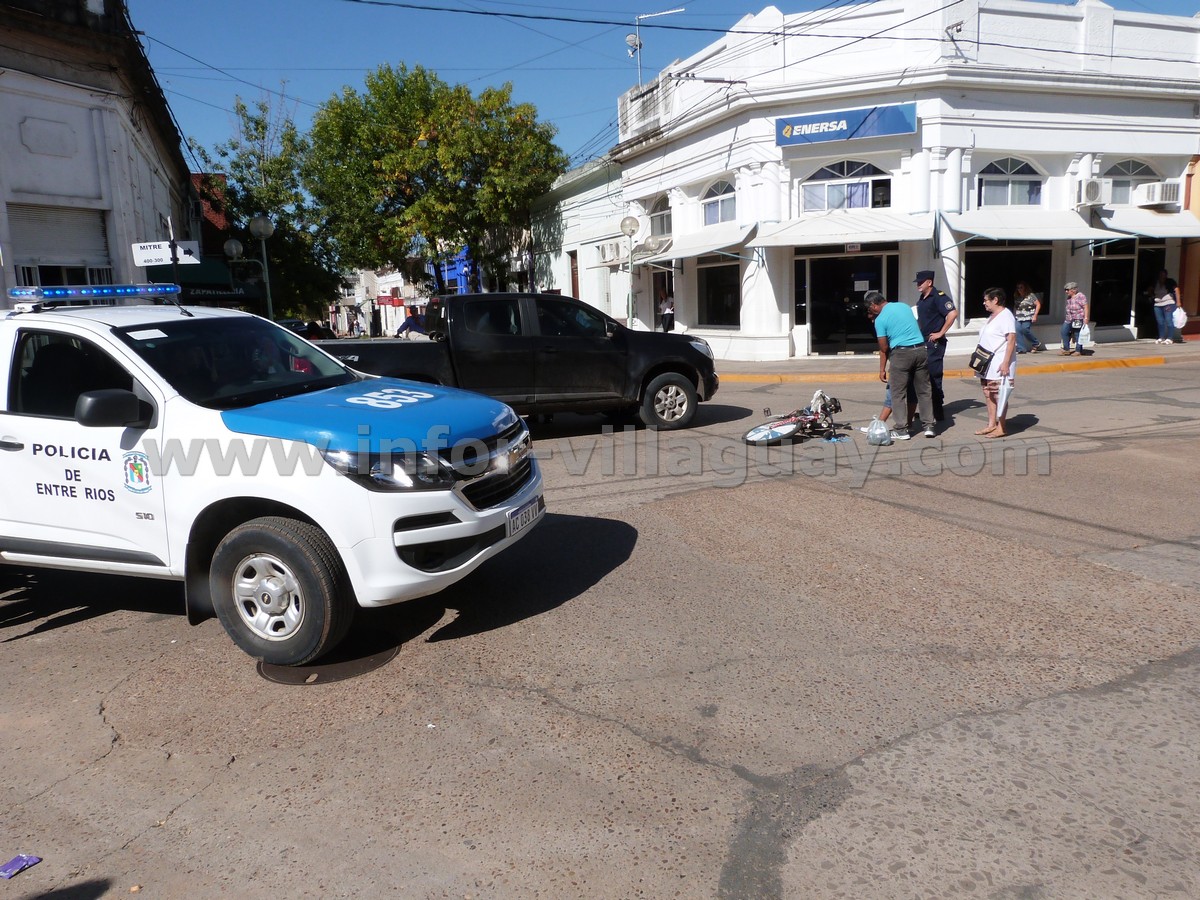 Por Rivadavia sentido sur/norte circulaba una pintoresca bicicleta conocida en la ciudad por algunos detalles que la hacen inconfundible mientras que por Mitre sentido este/Oeste lo hacia una Pick-Up Chevrolet 4X4 S10 color Negra, y al llegar a esa esquina colisionaron llevandosé la peor parte el ciclista, ya que debió ser trasladado a un centro asistencial a fin de evaluar sus golpes.