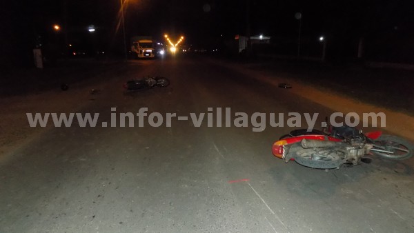 Por razones que se tratan de establecer colisionaron dos motocicletas, una marca Guerrero Trip conducida por una adolescente de 17 años de edad y otra moto marca Honda Biz conducida por un hombre de 43 años. A raíz del siniestro ambos conductores debieron ser trasladados hacia el Hospital local donde fueron examinados por el Médico de Policía en turno quien informó que ambos presentaban lesiones de carácter leves.-