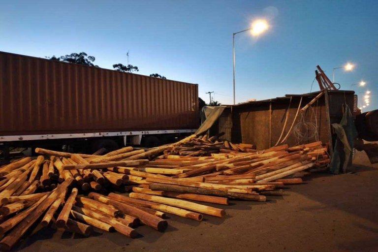 En dicho lugar, en el acceso a Colonia Alemana, un camión cargado con postes de madera, que circulaba en la mano Norte-Sur, por razones que se investigan, vuelca y su carga queda desparramada en toda la calzada.