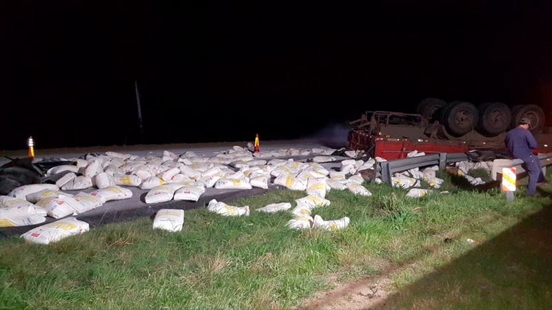 Por motivos que tratan de establecerse en forma fehaciente, se produjo el vuelco de un camión, el cual diseminó su carga de bolsas de harina sobre la ruta.