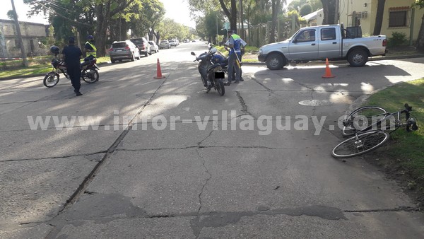 Siendo las 17:05 horas de este martes 23 de marzo se registró un siniestro vial en calle Concepción del Uruguay y P. Perón. Por razones que se tratan de establecer colisionaron una bicicleta, que circulaba por calle Uruguay de Norte a Sur, y donde se conducía un adolescente de 14 años de edad; y un motovehículo marca Motomel modelo Blitz 110 cc, que circulaba por calle Perón de Este a Oeste, y era conducida por una mujer de 44 años de edad. A raíz del siniestro la conductora de la moto debió ser trasladada en ambulancia al Hospital local, dándose intervención al Médico Policial, quien informó que la mujer presentaba lesiones de carácter leves. El adolescente se negó a ser atendido por personal de salud; haciéndose presente en el lugar su madre quien lo retiró del lugar.