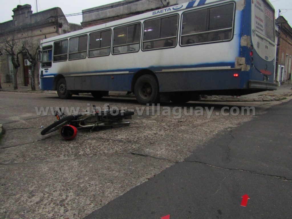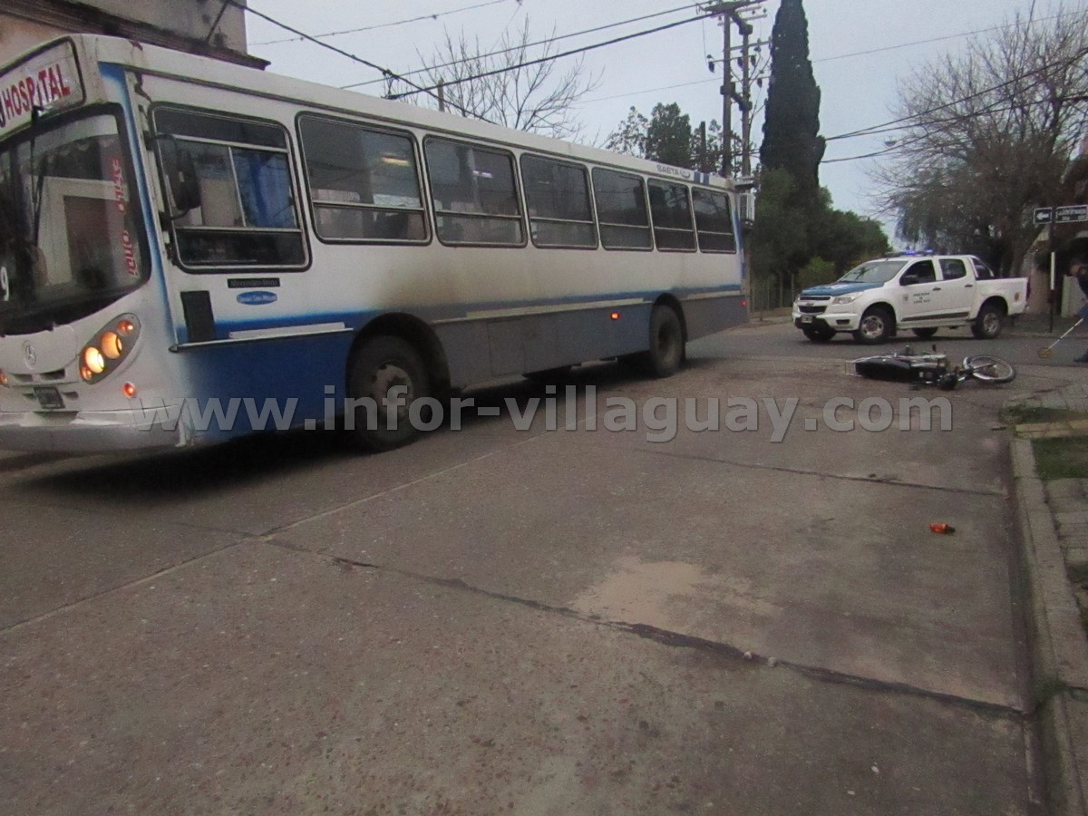 En la fecha siendo las 07.10 hs. personal de comisaria primera toma intervención en un accidente de tránsito en calle Urquiza y Uruguay por causa que se tratan de establecer colisiono una Moto Suzuki 100, contra un remis (que se dio a la fuga), como producto de impacto la acompañante de la moto es despedida y golpea con un colectivo de la