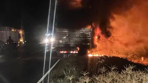 El hecho sucedió cerca de la 1.30 en el kilómetro 154 cuando se prendió fuego un camión Mercedes-Benz con jaula de dos pisos, que viajaba desde la localidad de Villaguay, Entre Ríos, hasta Quilino.