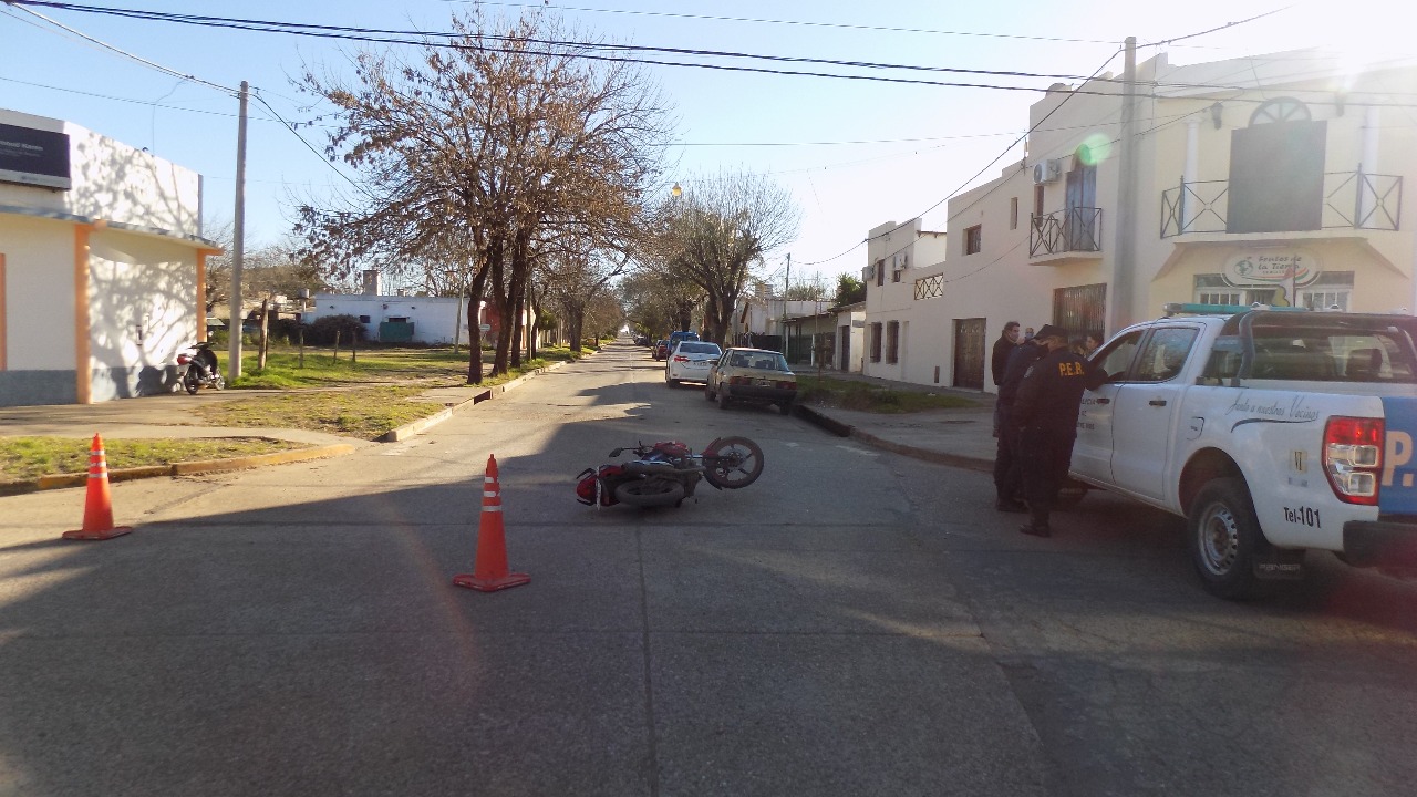 Como protagonistas tuvo a una motocicleta Marca Guerrero 150, conducida por un hombre de 36 años de edad, el cual circulaba por calle San Martín con sentido norte-sur, y un automóvil marca Toyota modelo Corolla conducido por una mujer de 60 años de edad, quien circulaba por calle Frías con sentido de circulación este-oeste. Producto del impacto el conductor del rodado de menor porte debió ser trasladado hacia el nosocomio local donde tomó intervención el médico policial en turno quien luego de examinar al ciudadano determinó que presentaba lesiones de carácter graves (fractura en dedos de pie izquierdo).