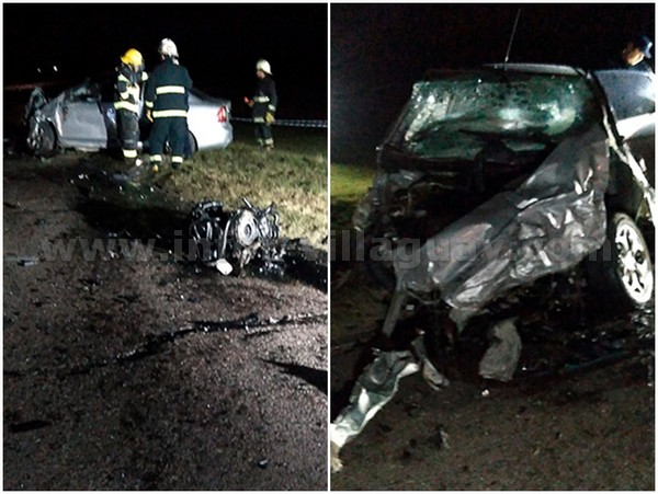 Conmoción en la localidad de General Ramírez por las repentinas pérdidas de un joven de 24 años y una mujer de 42. Por el violento impacto, se desprendió el motor de unos de los autos siniestrados.