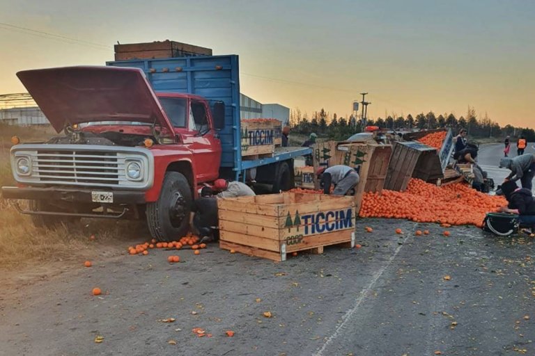 Allí, los bomberos debieron concurrir dado que – por motivos a determinar – se había producido el vuelco de carga de frutas de un camión rojo, de marca Ford. El rodado de gran porte circulaba con una chata vinera con personas a bordo.