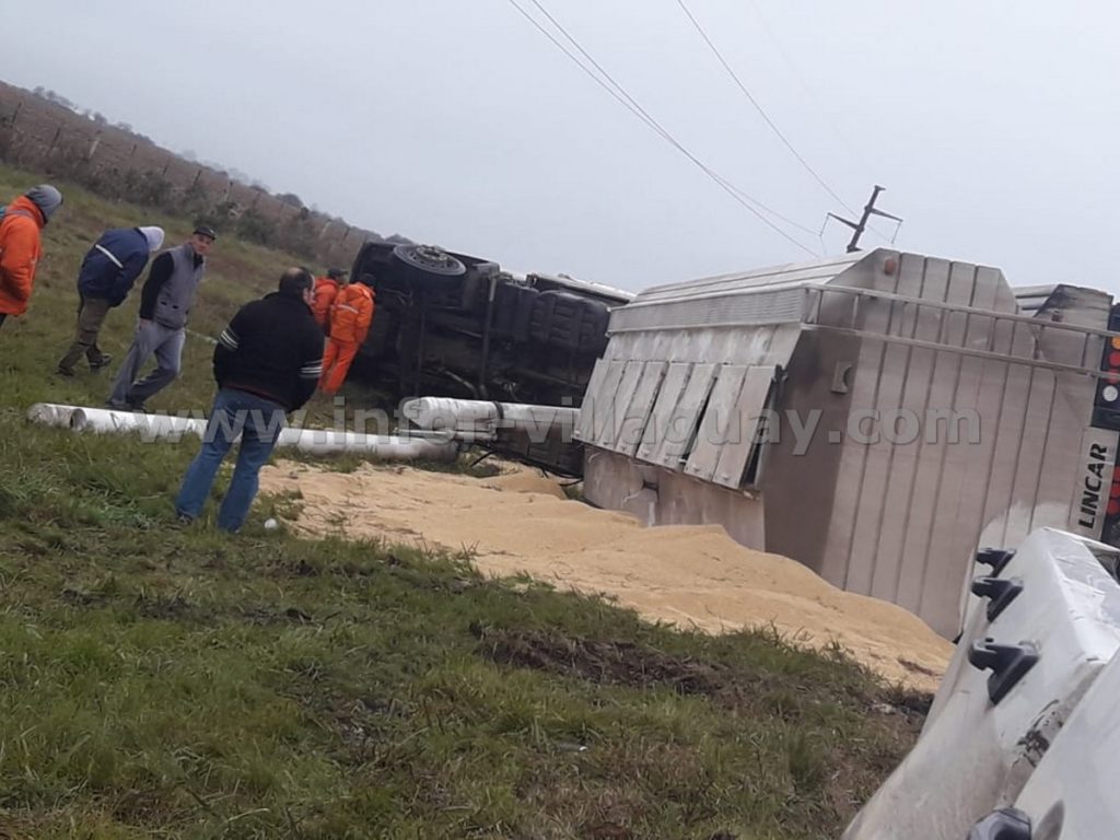 El pesado rodado circulaba de Oeste a Este quedando sobre la margen Sur, parte del acoplado en la banquina, con carga de alimentos para aves de granja avicola.