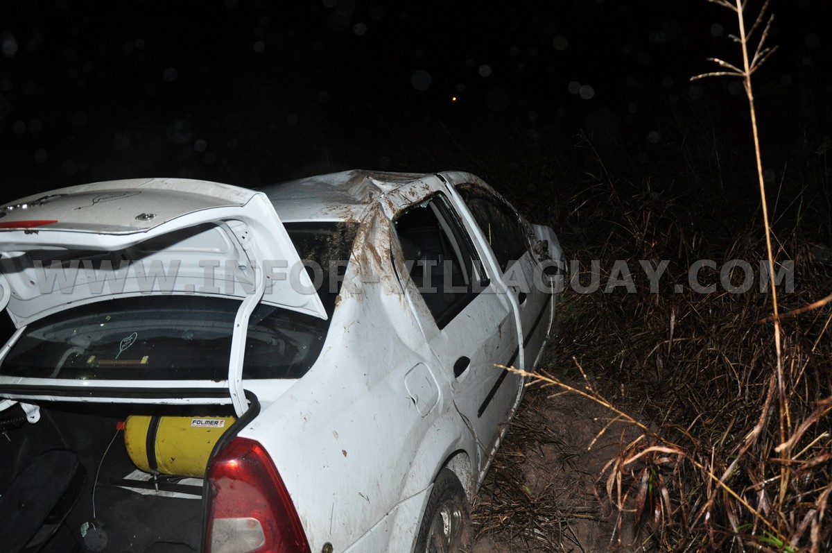 Aproximadamente a la  hora 23.00 de este Miercoles 30 de Mayo de 2018 un Vehiculo Renault Logan color blanco que circula sentido Este/Oeste aproximadamente km 140 de la ruta Nacional 18 (Curva antes de los puentes) baja una rueda a la  banquina interna de la curva, se desestabiliza, cruza la cinta asfáltica y vuelca en la banquina opuesta.-