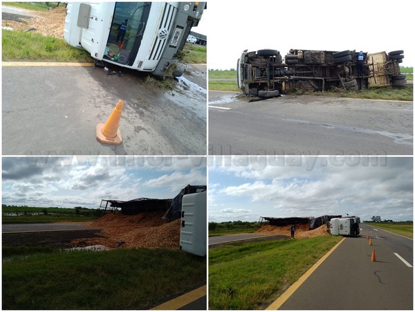 Un vez que se hacen en el lugar constatan el vuelco de un camión marca Volkswagen, modelo 17-220, dominio HQI 503 (duplicado), con acoplado marca Rendón, dominio VCG 507, cargado con chips de madera, conducido por Saucedo César Gabriel, 41 años, domicilio Matheu 1950 (villaguay), DNI 28.133.862. Dicha unidad es propiedad de la firma «Don Pichon», sita en la ciudad de Rosario y se dirigía hacia allí procedente de la ciudad de Federación. Se destaca que no hubo personas lesionadas.