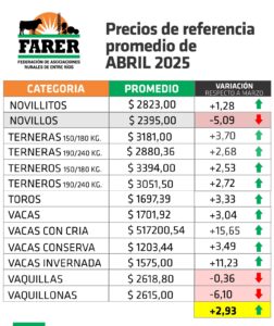 La Federación de Asociaciones Rurales de Entre Ríos (FARER) brindó este viernes los precios promedios de la hacienda en pie emanados de los distintos remates llevados a cabo durante abril en las instalaciones de las rurales entrerrianas.