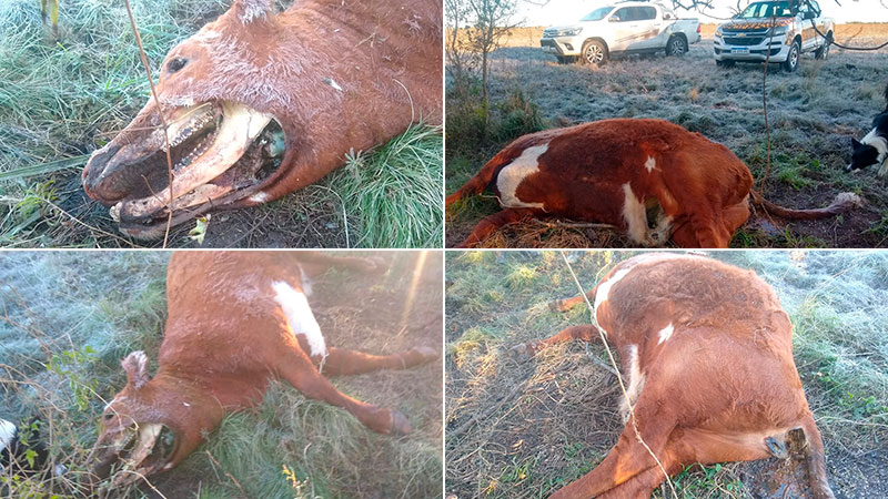 La vaquillona Aberdeen Angus, de pelaje colorado, estaba muerta debajo de un árbol y presentaba llamativas mutilaciones. Según indicaron fuentes policiales, al animal le faltaba la ubre, genitales, parte de la quijada, lengua y ojos. Además, se podía observar el hueso de la mandíbula, sin rastros de carne y en las zonas de los cortes se encuentra cauterizada la piel, sin sangrado.