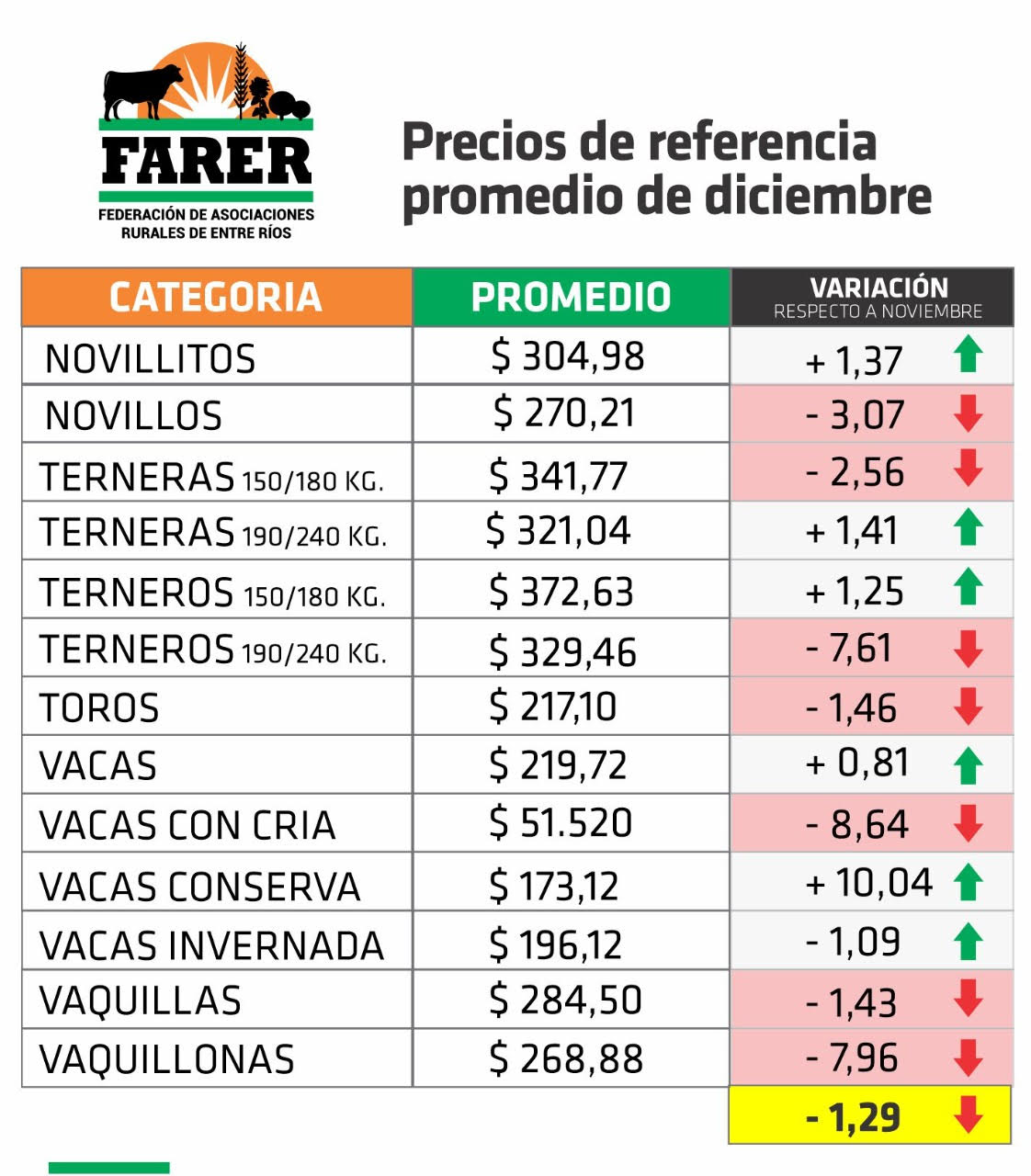 La Federación de Asociaciones Rurales de Entre Ríos (FARER) brindó hoy los datos concernientes al mes de diciembre en relación a los precios de la hacienda en pie. Los mismos son el resultado de los promedios de los remates que las firmas consignatarias realizan en las distintas sociedades rurales de nuestra provincia.