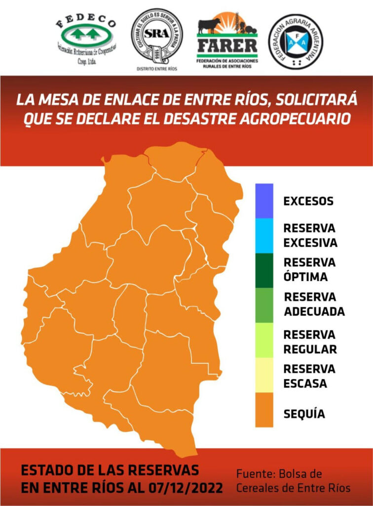 La Mesa de Enlace de Entre Ríos, reunida este miércoles 7 de diciembre, resolvió solicitar al ministro de Producción de Entre Ríos, Cr. Hugo Ballay, que convoque con carácter de urgente a la Comisión Provincial de Emergencia Agropecuaria para evaluar la difícil situación que atraviesa el sector, a lo largo y a lo ancho del territorio entrerriano, por el impacto de la profunda sequía y ola de calor.