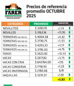 La Federación de Asociaciones Rurales de Entre Ríos (FARER) elaboró su relevamiento mensual de precios de hacienda en pie, en base a los valores obtenidos en los remates realizados por las distintas rurales de la provincia durante el mes de octubre. El informe refleja un incremento promedio del 5,82% respecto de septiembre, confirmando la tendencia alcista que se viene registrando en los últimos meses.