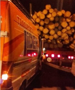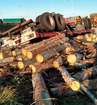 RUTA 14 – Le explotó una cubierta a camión con troncos: volcó y la carga quedó en la ruta