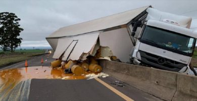 Un camión se arrecostó al divisorio de la 18 y volcó su cargamento en la ruta