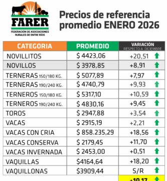 HACIENDA EN PIE: ENERO CERRÓ CON UN INCREMENTO PROMEDIO DEL 10,17 % EN LOS REMATES ENTRERRIANOS
