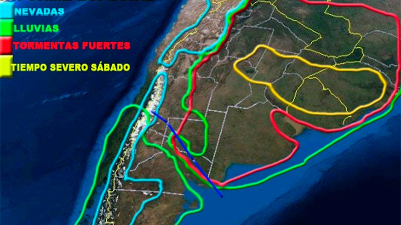 En tanto, el sábado a la madrugada, «una explosiva formación de tormentas tendrá lugar al centro, norte y nordeste de Córdoba, centro y norte de Santa Fe, sur de Santiago del Estero, sur de Corrientes, centro, sur y norte de Entre Ríos y República Oriental del Uruguay, con altas probabilidades de que las mismas sean severas», alerta el sitio Meteorología Argentina y Mundial. Podría registrarse la caída de granizo, fuertes vientos y lluvias.