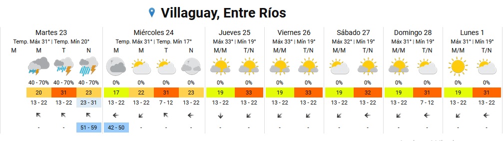 El pronóstico anticipa tormentas aisladas para la mañana, tormentas durante la tarde y tormentas fuertes para la noche, no solamente en los departamentos mencionados sino también en otras zonas de Entre Ríos como Federación, Concordia y Villaguay, entre otros departamentos.