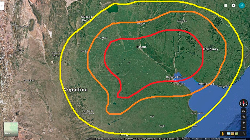 Así será «el amanecer de este día, con esta actividad de tormentas probablemente ya debilitándose y moviéndose hacia el este, habrá que ver donde quedan los frentes de ráfagas. Un límite podría quedar en una «comba» desde Gualeguaychú hacia Junín en la provincia de Buenos Aires, y podría ser foco de nuevas tormentas aisladas en la tarde», alerta el meteorólogo.