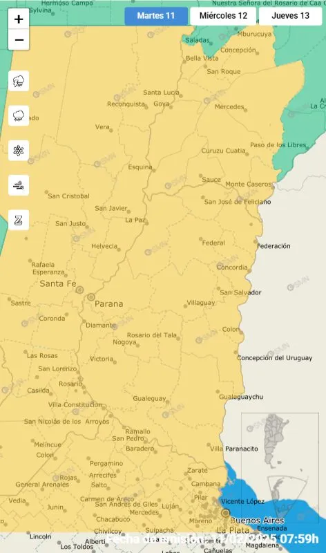 El alerta es para este martes y se extiende hasta este miércoles de mañana. Incluye a Paraná, La Paz, Diamante, Nogoyá, Villaguay, Concordia, Federal, Feliciano, Federación, San Salvador, Uruguay, Gualeguaychú, Tala, Islas, Colón, Victoria y Gualeguay.