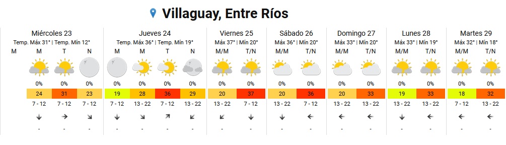 Sobre el Litoral y la Mesopotamia: temperaturas de 34°C y 37°C en Entre Ríos y Santa Fe.