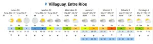 En Villaguay, para hoy lunes la mínima prevista es de 6 grados y mañana de 3. Son las únicas dos jornadas de frío. De allí en más, el calor se vuelve protagonista. El miércoles la temperatura máxima prevista es de 24 grados, el jueves 28 y el viernes 31.
