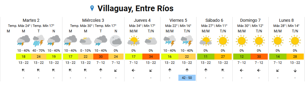 Anuncian “intensas ráfagas, fuerte actividad eléctrica, ocasional granizo y fundamentalmente abundante caída de agua en cortos períodos”. Se esperan “valores de precipitación acumulada de entre 30 y 50 milímetros”.