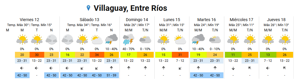 Durante la madrugada del domingo «el centro y oeste entrerriano serían afectados por situaciones de inestabilidad con chaparrones que podrían ser bastante intensos, con posibilidad de algunas granizadas. A la mañana se desplazará hacia el este».