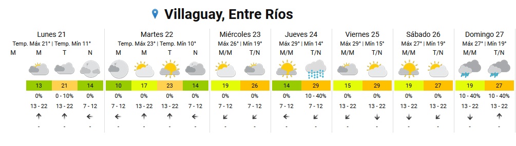 En Villaguay, Paraná y La Paz, por su parte, se esperan precipitaciones para el jueves y el domingo.En Concordia se prevén lluvias y chaparrones para hoy, el miércoles, jueves y domingo; y en Gualeguay, el martes, jueves, viernes y domingo.Según el SMN, las temperaturas oscilarán entre los 11ºC y los 21ºC en nuestra provincia. Pero entre el jueves y el sábado, las máximas treparán hasta 10 grados y se ubicarán entre los 28ºC y 31ºC.