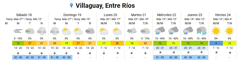 Para hoy, sábado, el organismo prevé una temperatura máxima de hasta 27°C.A las 8 de la mañana se registraron algunas neblinas en la provincia, muchísima humedad -entre 86 y 100%- e incluso algunas lloviznas en las zonas de Victoria, Gualeguaychú, Gualeguay, Colón, Tala, Ibicuy, San Salvador y Concepción del Uruguay.Si bien las temperaturas ya se mostraron desde temprano superiores a los 12°C con vientos del noreste, las ciudades de Concordia, Federación, Federal y Feliciano superaron ampliamente al resto de la provincia y amanecieron con 19,4°C.