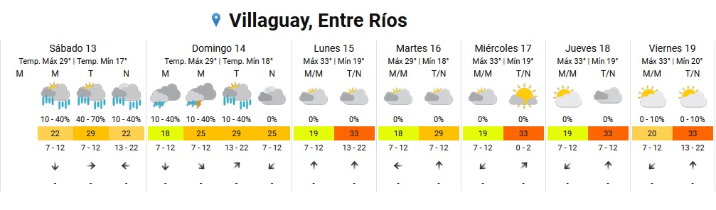 Este sábado, comienzo del fin de semana largo de Carnaval, arrancó con sol en Paraná y zona, no obstante el Servicio Meteorológico Nacional anticipa tiempo inestable para sábado y domingo. La temperatura a las 6, era de 17.5ºC.En la capital entrerriana y sus alrededores se esperan lluvias para el sábado y el domingo, con temperaturas máximas que no superarán los 30 grados.De acuerdo a los datos brindados por el Servicio Meteorológico Nacional, para este sábado se espera un cielo mayormente nublado, con chaparrones hacia la tarde/noche y una temperatura que irá desde los 17° hasta los 29°.Luego, para el domingo, se prevé un tiempo inestable, con probabilidad de precipitaciones durante toda la jornada, con tormentas aisladas pro a mañana y chaparrones por la tarde y una temperatura que irá desde los 18° hasta los 29°.