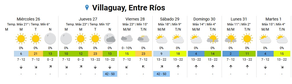 En tanto para este miércoles se aguardan temperaturas mínimas de 6 grados y máximas de 21, para mañana jueves mínima de 10 y máxima de 23, viernes con mínima de 15 y máxima de 23 y sábado con mínima de 9 y máxima de 18. Ya el domingo, como mencionamos anteriormente, la ola polar comienza a instalarse en la región y en Villaguay la mínima será de 4 y la máxima de 14
