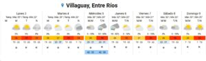 EnVillaguay, el Servicio Meteorológico Nacional (SMN) anticipa que el miércoles por la tarde comenzará la inestabilidad, continuando durante el jueves con tormentas que favorecerán un descenso de las temperaturas, que podrían llegar a los 30 °C.