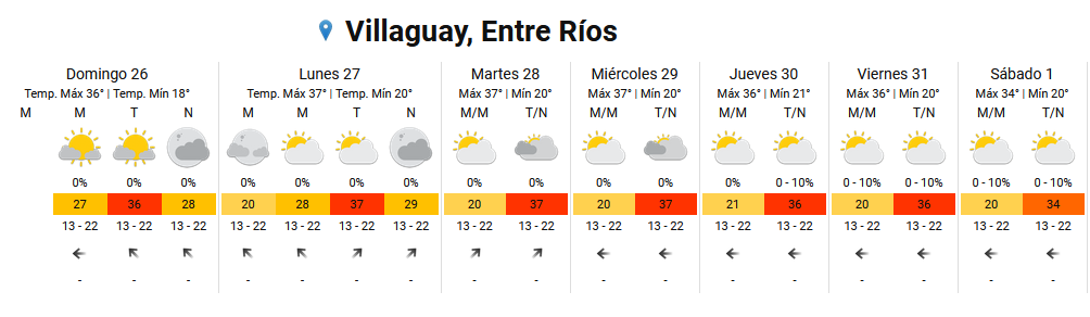 Según el SMN, para este domingo en Villaguay se esperan altas temperaturas, la mínima será de 18º y la máxima prevista es de 36º.
