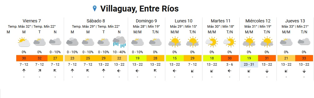 Temperatura máxima en leve descenso o en poco cambio sobre el Norte y Centro Este de la provincia, y en descenso sobre el resto de la misma. Condición VERDE a AMARILLA (por altas temperaturas en los sectores indicados). Y Condición VERDE a AMARILLA y temporalmente NARANJA (para sectores inestables del Centro y Sur de la provincia) Temperatura Máxima pronosticada: entre 28 y 36° C. / S. T. máxima: 29 a 43° C. Mayores sobre el Noreste y Centro Este de la provincia.