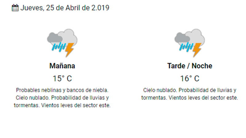 El organismo pronostica para hoy en Villaguay lluvias y tormentas, con una temperatura máxima que llegaría sólo a 16 grados. El viernes seguiría la probabilidad de precipitaciones, aunque ya no serían demasiado intensas.