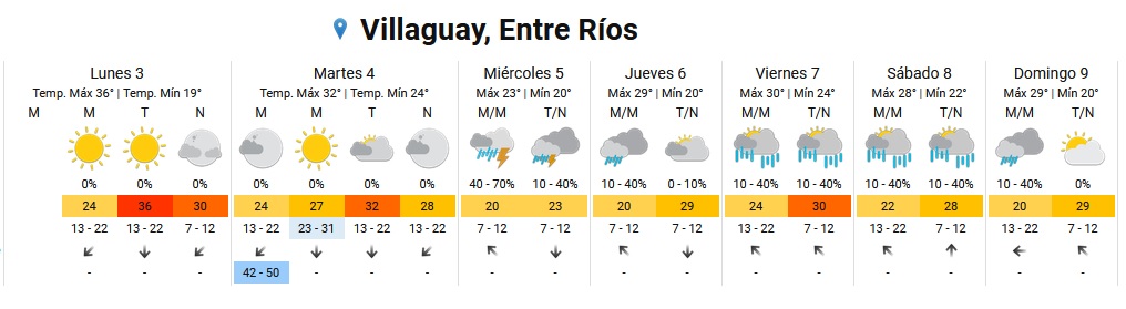 No se anuncian precipitaciones para hoy ni mañana en esta zona. El miércoles llegaría el alivio, acompañado por tormentas. De acuerdo con el Servicio Meteorológico Nacional, las condiciones de inestabilidad con probables precipitaciones se mantendrían luego en Entre Ríos al menos hasta el sábado.
