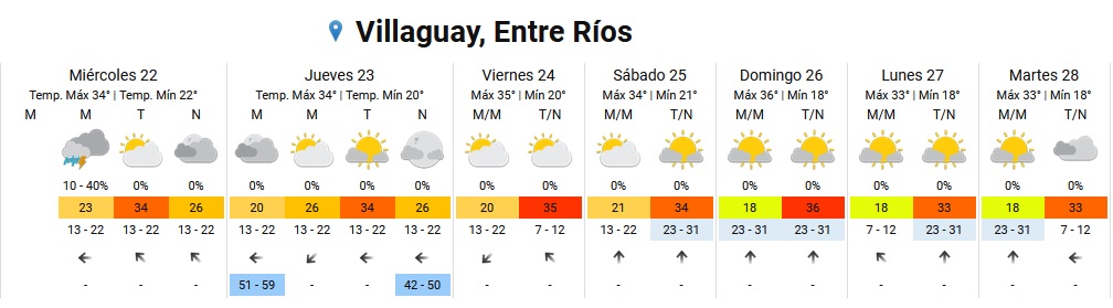En el caso de Entre Ríos, se esperan para hoy vientos regulares a débiles del sudeste y este. Nublado, alto porcentual de la humedad, inestable y probabilidad de precipitaciones con algunas tormentas dispersas” en las primeras horas del día. Luego se produciría una disminución de la nubosidad, por lo que estará caluroso por la tarde con alta sensación térmica, al tiempo que no descartan ocasionales chaparrones muy aislados hacia la noche. Las temperaturas máximas rondarían los 35 grados.