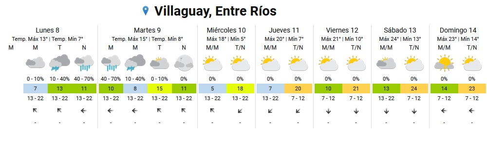 El Servicio Meteorológico Nacional (SMN) prevé un paulatino ascenso de temperaturas promedio a partir del jueves. El lunes inicia la semana laboral con neblinas matinales y temperaturas de entre 7 y 13 grados centígrados. Por la tarde y noche se esperan lluvias. La dirección predominante del viento será del este.