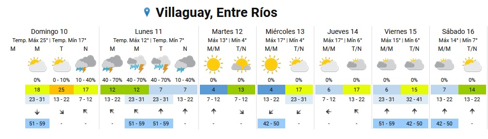Los fenómenos se darían este domingo por la tarde. Esa zona de Entre Ríos se mantienen bajo alerta amarilla, que indica que «la región será afectada por tormentas de variada intensidad, pudiendo ser algunas localmente fuertes», según la explicación del SMN.