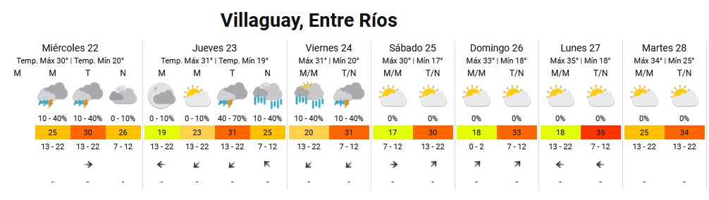 Según indica el Servicio Meteorológico Nacional, para hoy se estiman temperaturas máximas que rondarán los 30 grados en Entre Ríos, con cielo mayormente nublado y probabilidad de tormentas aisladas, sobre todo desde la tarde en el oeste provincial, por lo que podrían alcanzar a Paraná.