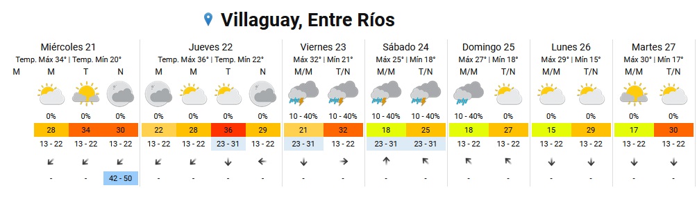 Según se puede apreciar en el pronóstico informado por el Servicio Meteorológico Nacional (SMN) ya desde la noche del viernes 23 de diciembre la posibilidad de lluvia es del 40% y se extenderían hasta la mañana del domingo de navidad. Asimismo se adelanta que la temperatura sufriría un descenso de las temperaturas máximas.