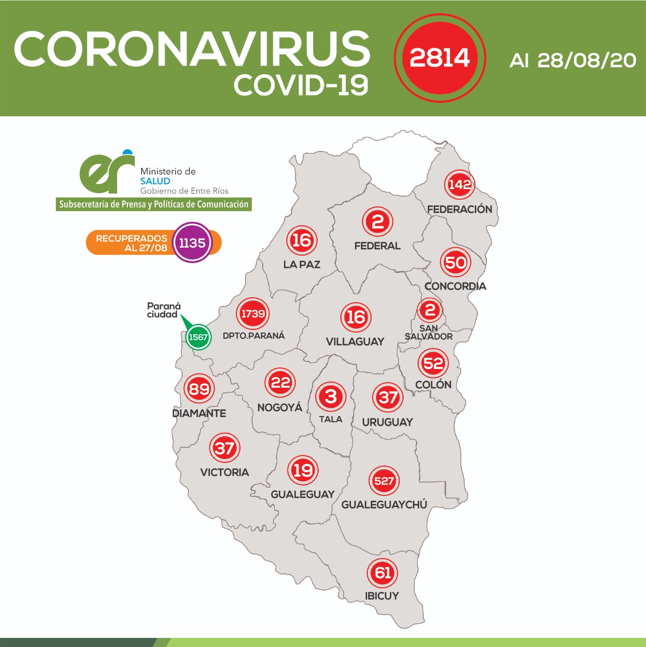 A partir de los datos reportados al 28 de Agosto de 2020 por el área de Vigilancia Epidemiológica del Ministerio de Salud, en Entre Ríos se han sumado 119 casos de Coronavirus.
