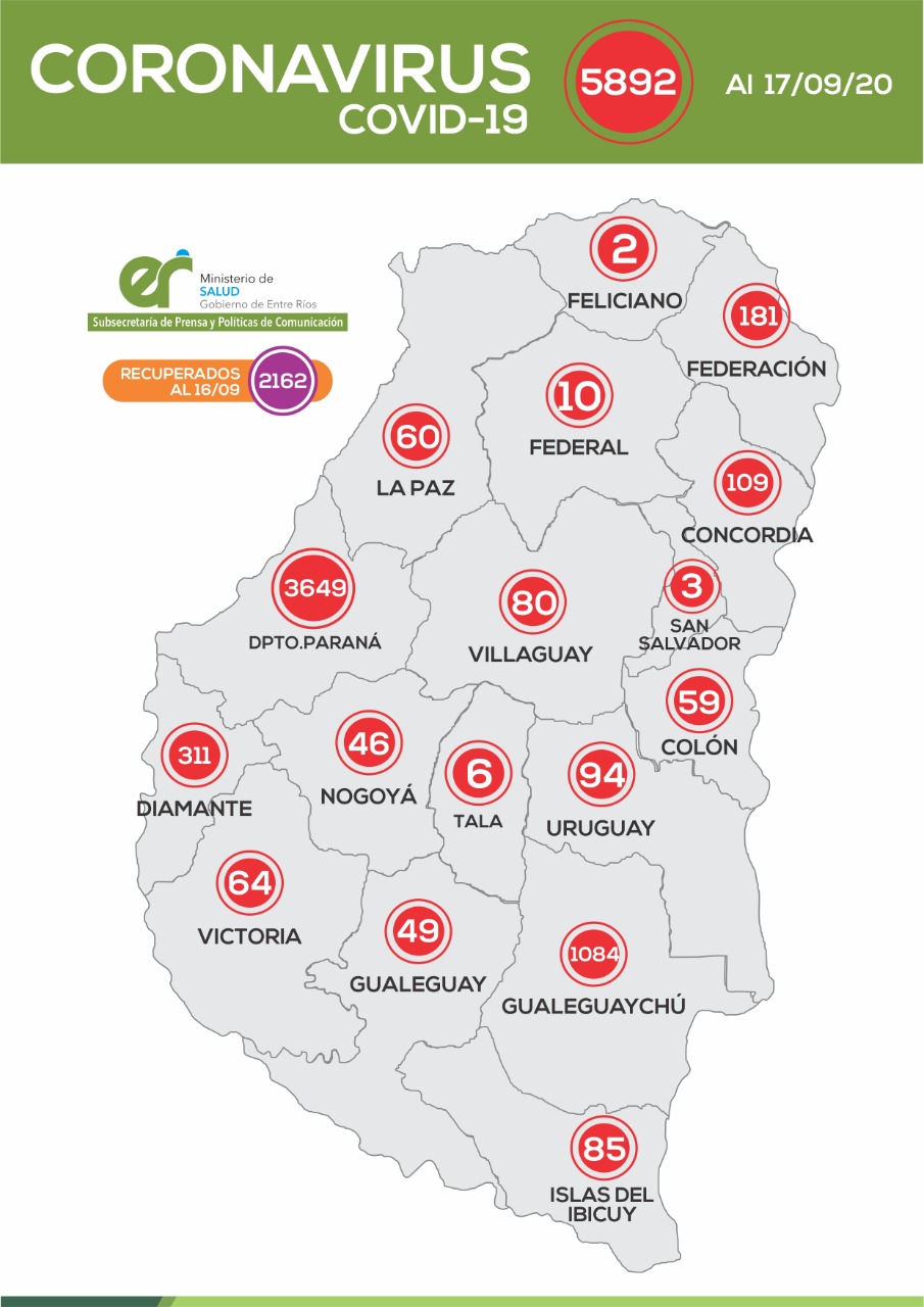 De acuerdo a los datos reportados al 17 de Septiembre de 2020 por el área de Vigilancia Epidemiológica del Ministerio de Salud, en Entre Ríos se han sumado 132 casos de Coronavirus que se distribuyen departamentalmente de la siguiente manera: