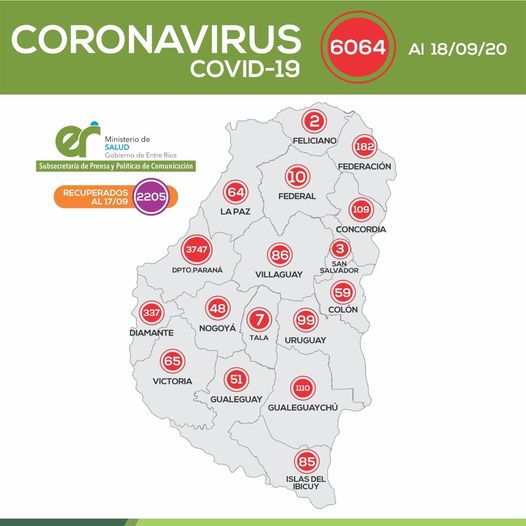 En virtud de los datos reportados al 18 de Septiembre de 2020 por el área de Vigilancia Epidemiológica del Ministerio de Salud, en Entre Ríos se han sumado 173 casos de Coronavirus que se distribuyen departamentalmente de la siguiente manera: