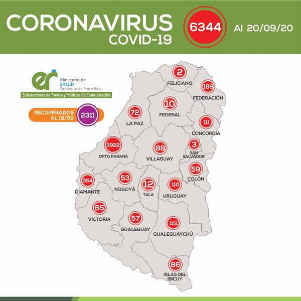 De acuerdo a los datos reportados al 20 de Septiembre de 2020 por el área de Vigilancia Epidemiológica del Ministerio de Salud, en Entre Ríos se han sumado 134 casos de Coronavirus que se distribuyen departamentalmente de la siguiente manera: